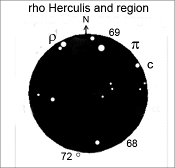 The star just over one degree to the east of pi, rho Herculis, is a telescopic binary (Struve 2161) with lovely colour contrast of yellow and blue: 4.5, 5.4; 319º, 4.1".
