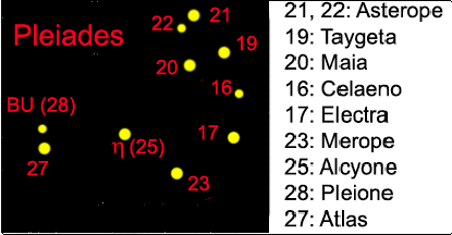 Alcyone (eta Tauri), Electra, Maia, Merope, Taygeta, Celaeno, and Asterope.