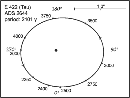 Struve 422 is a wide visual binary with an orbit of over 2000 years: 5.9, 8.8; PA 269º, 6.7". It's located at 9º SW of nu Tauri, just north of the brighter 10 Tauri.